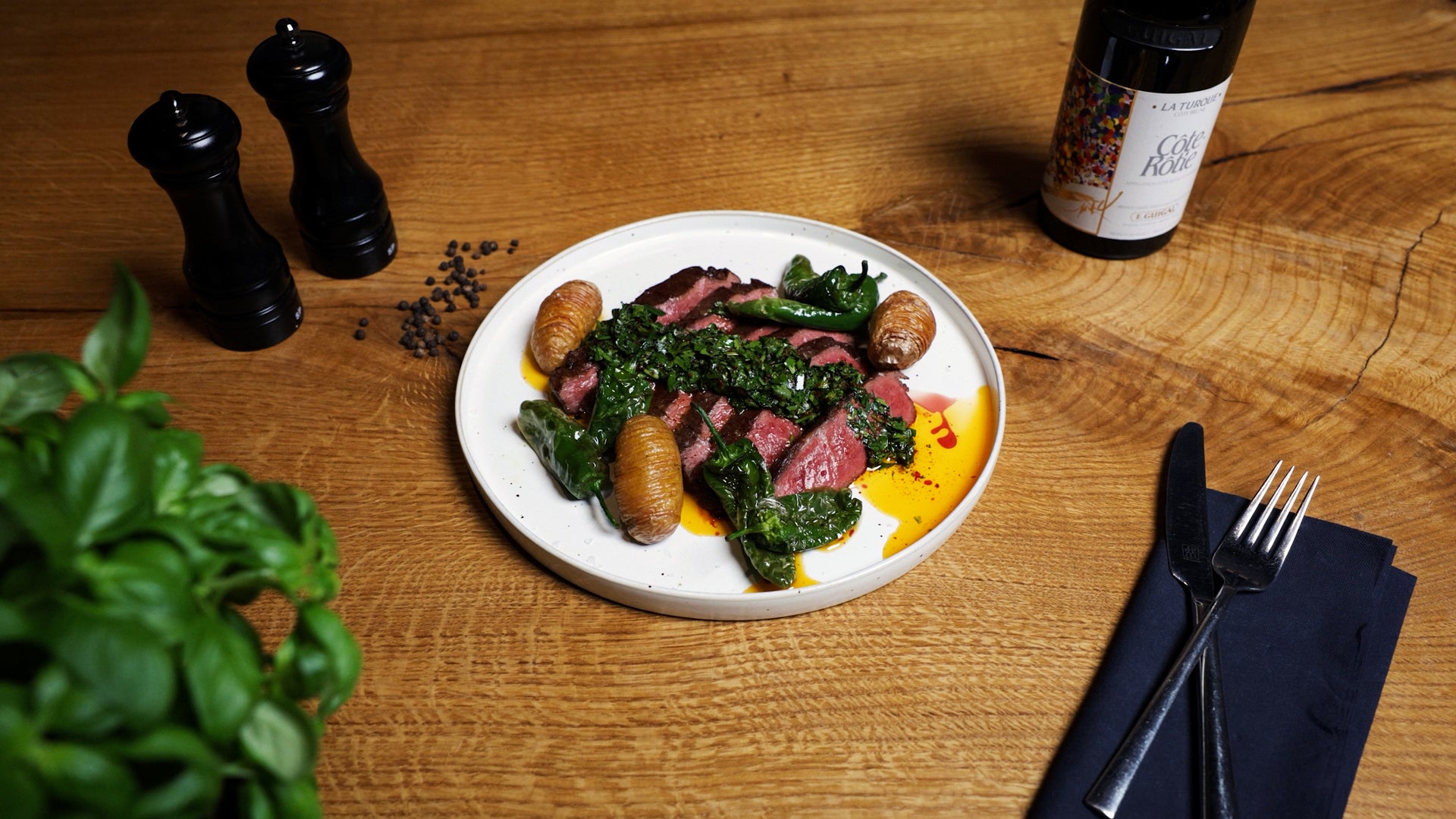 Wagyu Australian Cut mit frischem Chimichurri & knusprigen Hasselback-Kartoffeln